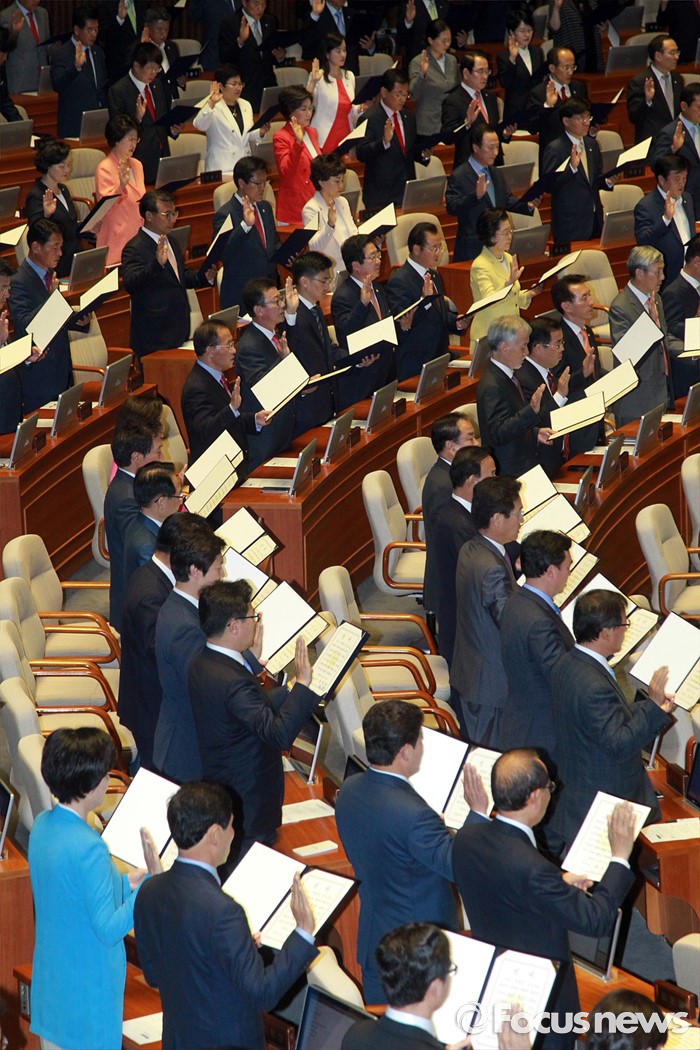 (서울=포커스뉴스) 13일 오전 서울 여의도 국회에서 열린 20대 국회 개원식에 참석한 의원들이 선서를 하고 있다.