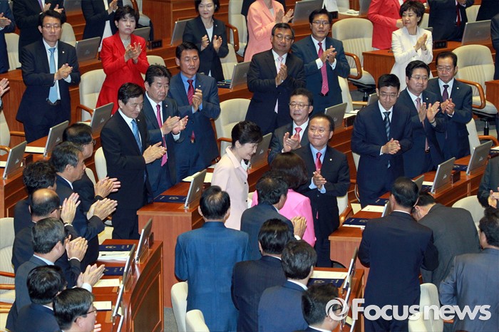 (서울=포커스뉴스) 박근혜 대통령이 13일 오전 서울 여의도 국회에서 열린 20대 국회 개원식에 참석해 의원들의 박수를 받으며 단상으로 향하고 있다.