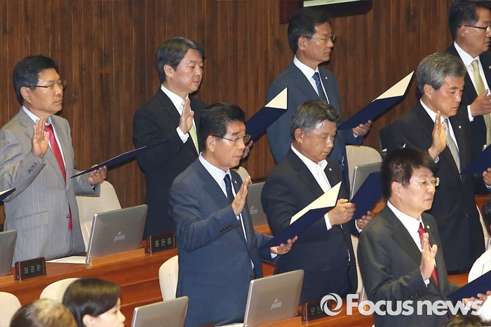 (서울=포커스뉴스) 13일 오전 서울 여의도 국회에서 열린 20대 국회 개원식에 참석한 안철수 국민의당 상임공동대표 등 의원들이 선서를 하고 있다.