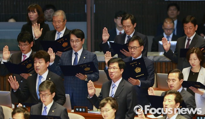 (서울=포커스뉴스) 13일 오전 서울 여의도 국회에서 열린 20대 국회 개원식에 참석한 김종인 더불어민주앙 비대위 대표 등 의원들이 선서를 하고 있다.