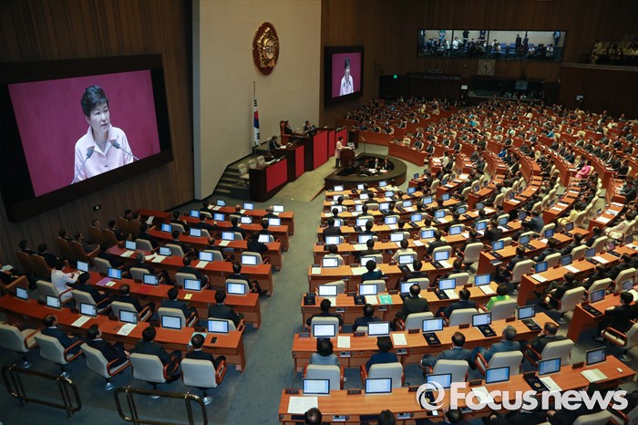 (서울=포커스뉴스) 박근혜 대통령이 13일 오전 서울 여의도 국회에서 열린 20대 국회 개원식에 참석해 연설을 하고 있다.