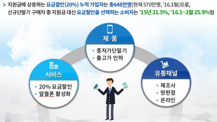 단통법 이후 소비자들의 각광을 받은 지원금에 상응하는 요금할인(이하 20%요금할인)의 향방도 주목된다. 20%요금할인은 휴대폰 구매 시 이동통신사 지원금 대신 요금할인을 받을 수 있게 한 제도로, 정부가 이통사 지원금을 토대로 산정했다. 이통사 지원금을 받을 때는 약정기간이 2년이지만 20%요금할인은 1년 약정과 2년 약정 중 선택할 수 있고, 평균 10만원대인 이통사 지원금보다 할인폭이 커서 가입자가 빠르게 증가해왔다.