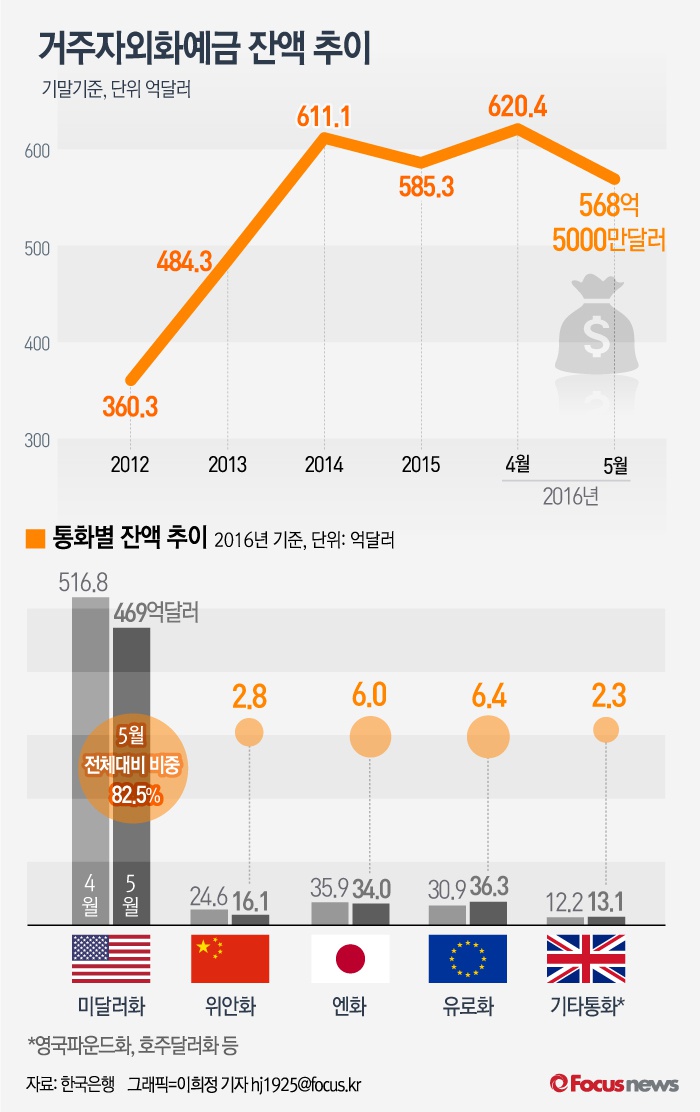 (서울=포커스뉴스) 한국은행이 13일 발표한 '2016년 5월말 거주자외화예금 현황'을 보면 5월 말 기준 외국환은행의 거주자외화예금은 568억5000만달러로 전월 대비 51억9000만달러 줄어들었다.특히 5월 미국 달러화는 469억달러로 전월대비 47억8000만달러 감소했다.