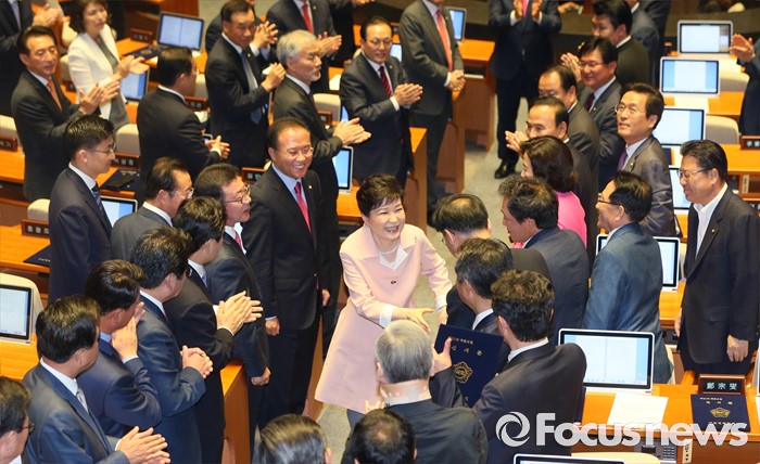 (서울=포커스뉴스) 박근혜 대통령이 13일 오전 서울 여의도 국회에서 열린 20대 국회 개원식에 참석해 연설을 마친 뒤 의원들과 인사하며 퇴장하고 있다.