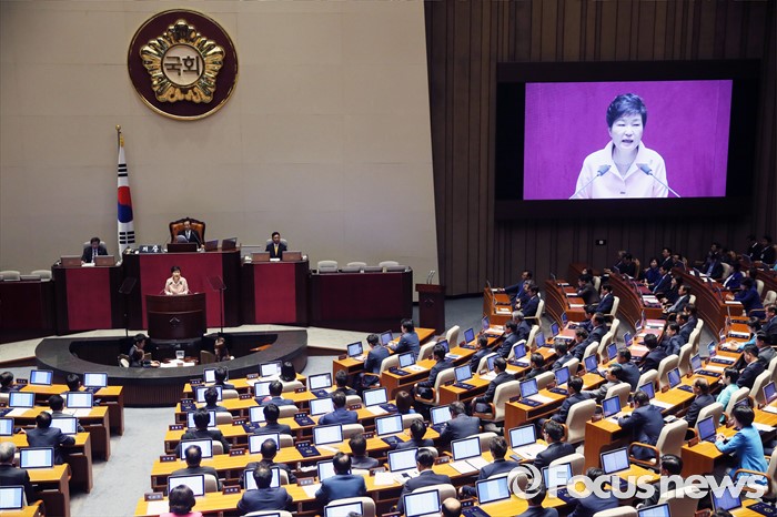 (서울=포커스뉴스) 박근혜 대통령이 13일 오전 서울 여의도 국회에서 열린 20대 국회 개원식에 참석해 연설을 하고 있다.