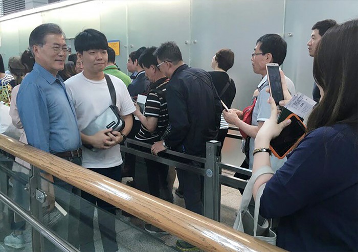 (인천공항=포커스뉴스) 문재인 전 더불어민주당 대표가 네팔 히말라야 트래킹과 현지 자원봉사를 위해 13일 오전 인천국제공항 출국장에서 시민들과 기념촬영을 하고 있다. <사진제공=문재인 전 대표>