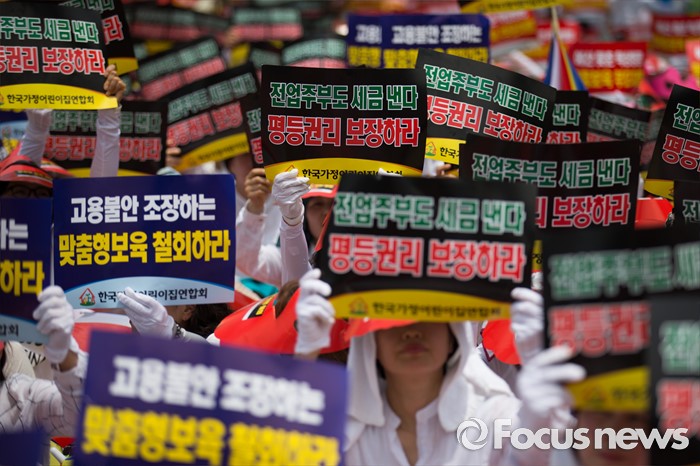 (서울=포커스뉴스) 13일 오후 서울 여의도 KB국민은행 앞에서 한국가정어린이집연합회 회원들이 맞춤형 보육 저지와 누리과정 예산 해결 및 평등지원을 촉구하는 결의대회를 하고 있다.