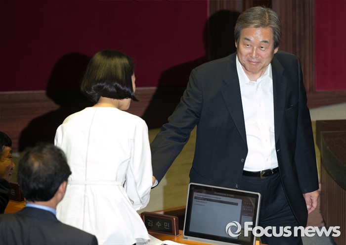 (서울=포커스뉴스) 13일 오후 서울 여의도 국회에서 상임위원장 선출을 위해 열린 343회 국회(임시회) 2차 본회의에 참석한 김무성(오른쪽) 새누리당 전 대표가 김수민 국민의당 의원과 인사하고 있다.