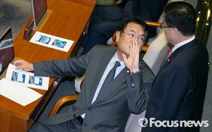 (서울=포커스뉴스) 13일 오후 서울 여의도 국회에서 상임위원장 선출을 위해 열린 343회 국회(임시회) 2차 본회의에 참석한 정진석(왼쪽) 새누리당 원내대표와 김광림 정책위의장이 대화하고 있다.
