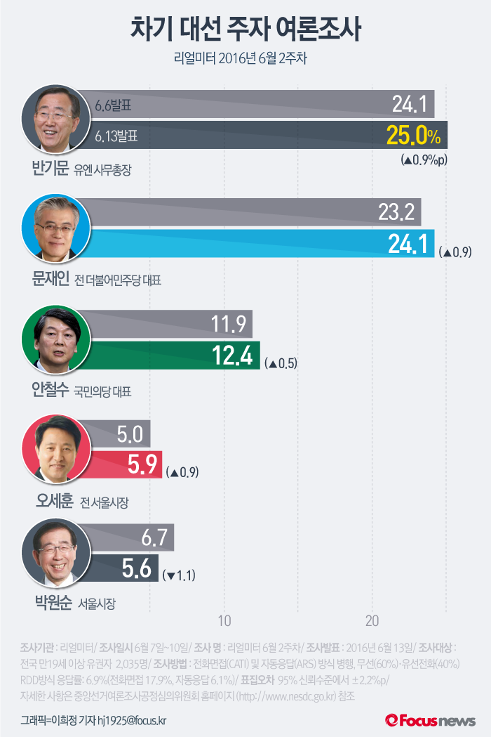 (서울=포커스뉴스) 여론조사 전문기관 리얼미터가 13일 발표한 6월2주차 주간집계 여론조사 결과에 따르면 반 총장의 지지율은 일주일 전보다 0.9%p 상승한 25.0%로 집계됐다. 반 총장은 지난주에 이어 2주 연속 1위 자리를 지켰다.