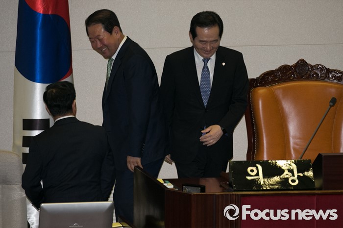 (서울=포커스뉴스) 13일 오후 서울 여의도 국회에서 상임위원장 선출을 위해 열린 343회 국회(임시회) 2차 본회의에 참석한 정세균(오른쪽) 국회의장과 박주선(가운데) 국회 부의장이 자리를 교대하고 있다.