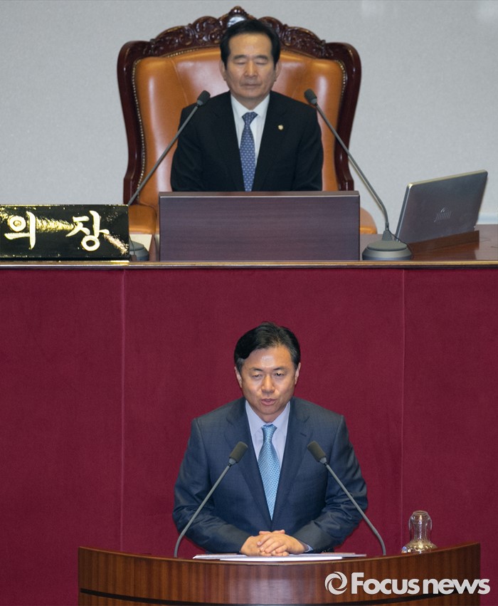 (서울=포커스뉴스) 13일 오후 서울 여의도 국회에서 열린 343회 국회(임시회) 2차 본회의에 참석한 김영춘 신임 농림축산식품해양수산위원장이 당선 인사를 하고 있다.