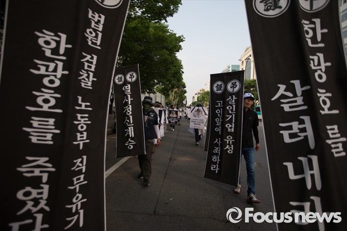 (서울=포커스뉴스) 13일 오후 유성기업 노동자 故 한광호씨의 분향소를 양재동 현대차 본사 앞으로 옮기는 꽃길 100리 행진에 참여한 노동자들이 시청 분향소를 떠나 국회를 향하고 있다.