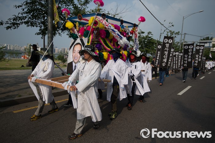(서울=포커스뉴스) 13일 오후 유성기업 노동자 故 한광호씨의 분향소를 양재동 현대차 본사 앞으로 옮기는 꽃길 100리 행진에 참여한 노동자들이 시청 분향소를 떠나 국회를 향하고 있다.