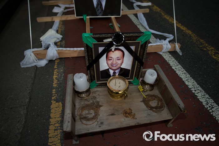 (서울=포커스뉴스) 13일 오후 유성기업 노동자 故 한광호씨의 분향소를 양재동 현대차 본사 앞으로 옮기는 꽃길 100리 행진에서 故 한광호씨의 영정사진이 상여 앞에 놓여져 있다.