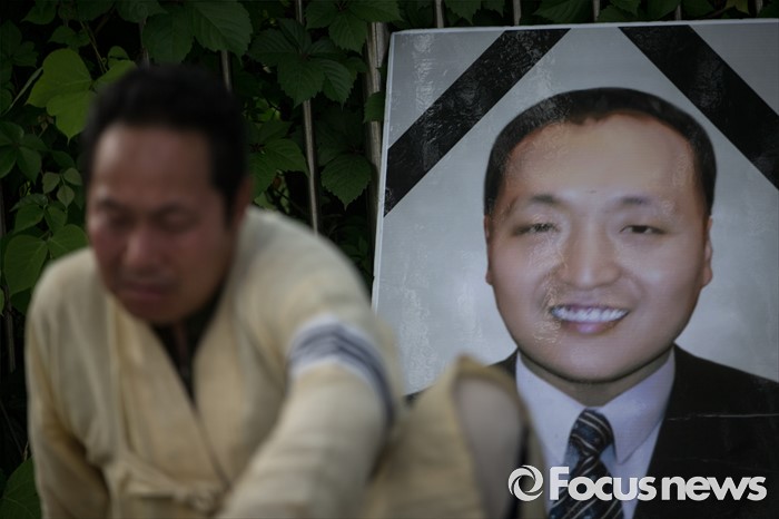(서울=포커스뉴스) 13일 오후 유성기업 노동자 故 한광호씨의 분향소를 양재동 현대차 본사 앞으로 옮기는 꽃길 100리 행진에 참여한 어느 한 노동자가 故 한광호씨의 영정사진 앞에서 슬픔에 잠겨 있다.