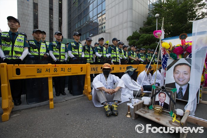 (서울=포커스뉴스) 13일 오후 유성기업 노동자 故 한광호씨의 분향소를 양재동 현대차 본사 앞으로 옮기는 꽃길 100리 행진에 참여한 노동자들이 시청 분향소에서 출발해 국회로 행진하던 중 더불어 민주당 당사 앞에서 잠시 휴식을 취하고 있다.