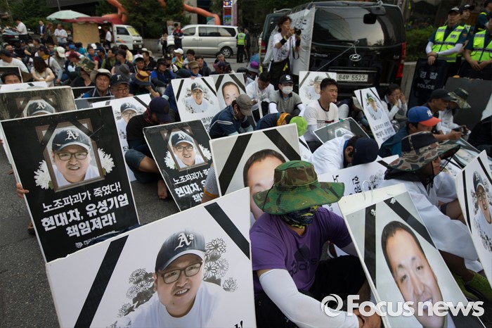 (서울=포커스뉴스) 13일 오후 유성기업 노동자 故 한광호씨의 분향소를 양재동 현대차 본사 앞으로 옮기는 꽃길 100리 행진에 참여한 노동자들이 시청 분향소에서 출발해 국회로 행진하던 중 더불어 민주당 당사 앞에 멈춰 집회를 하고 있다.