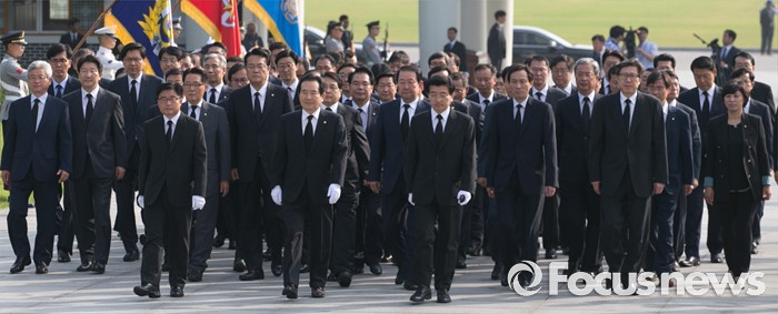 (서울=포커스뉴스) 정세균 국회의장과 정진석 새누리당 원내대표, 우상호 더불어민주당 원내대표, 박지원 국민의당 원내대표, 20대 국회 전반기 상임위원장들이 14일 오전 동작구 국립서울현충원을 방문해 참배를 위해 이동하고 있다.