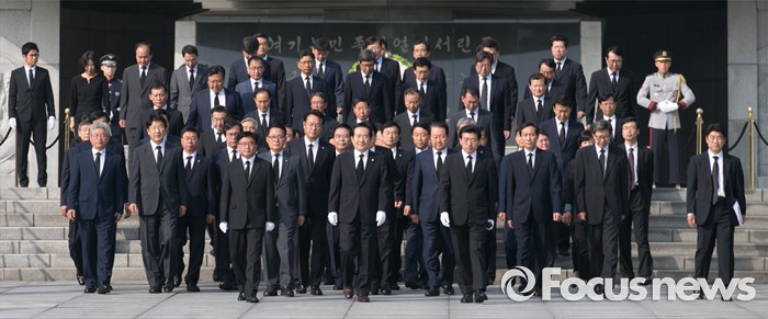 (서울=포커스뉴스) 정세균 국회의장과 정진석 새누리당 원내대표, 우상호 더불어민주당 원내대표, 박지원 국민의당 원내대표, 20대 국회 전반기 상임위원장들이 14일 오전 동작구 국립서울현충원을 방문해 참배를 마친 뒤 이동하고 있다.
