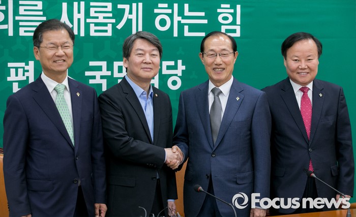 (서울=포커스뉴스) 안철수(왼쪽 두번째) 국민의당 상임공동대표, 천정배(왼쪽 첫번째) 공동대표가 14일 오전 서울 여의도 국회를 방문한 이원종(오른쪽 두번째) 대통령비서실장, 김재원 청와대 정무수석과 인사하고 있다.