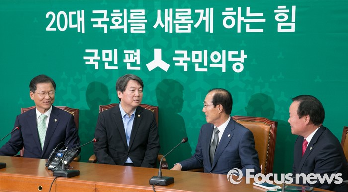 (서울=포커스뉴스) 안철수(왼쪽 두번째) 국민의당 상임공동대표, 천정배(왼쪽 첫번째) 공동대표가 14일 오전 서울 여의도 국회를 방문한 이원종(오른쪽 두번째) 대통령비서실장, 김재원 청와대 정무수석과 면담을 하고 있다.