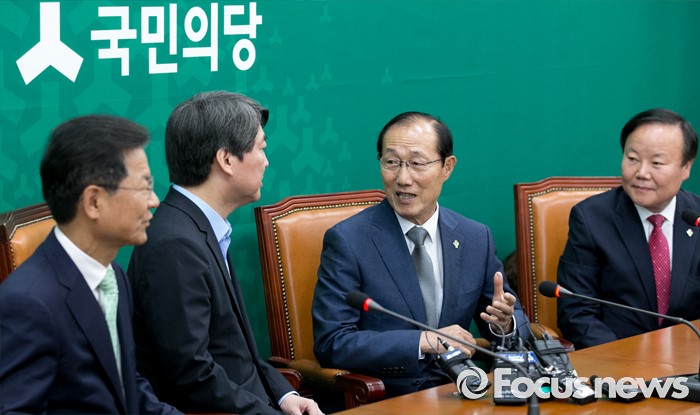 (서울=포커스뉴스) 안철수(왼쪽 두번째) 국민의당 상임공동대표, 천정배(왼쪽 첫번째) 공동대표가 14일 오전 서울 여의도 국회를 방문한 이원종(오른쪽 두번째) 대통령비서실장, 김재원 청와대 정무수석과 면담을 하고 있다.