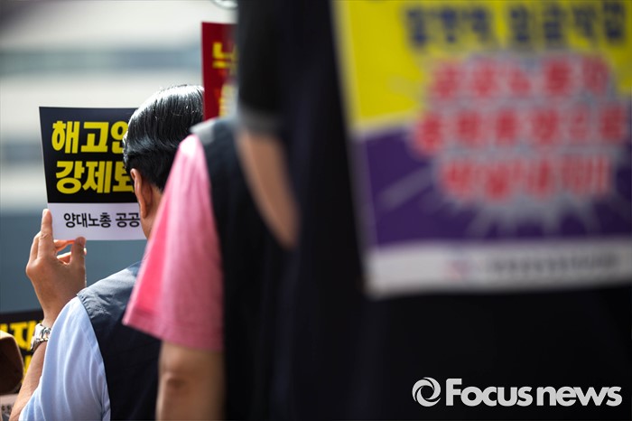 (서울=포커스뉴스) 14일 오전 서울 종로구 세종문화회관 앞에서 양대노총 공공부문공대위가 주최하는 '성과연봉제 중단 촉구 및 공공기관장 워크숍 규탄 기자회견'이 열리고 있다.