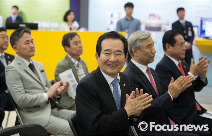 (서울=포커스뉴스) 정세균(가운데) 국회의장이 14일 오전 서울 여의도 국회 의원회관에서 열린 국회도서관 박람회 개막식에 참석해 박수를 치고 있다.