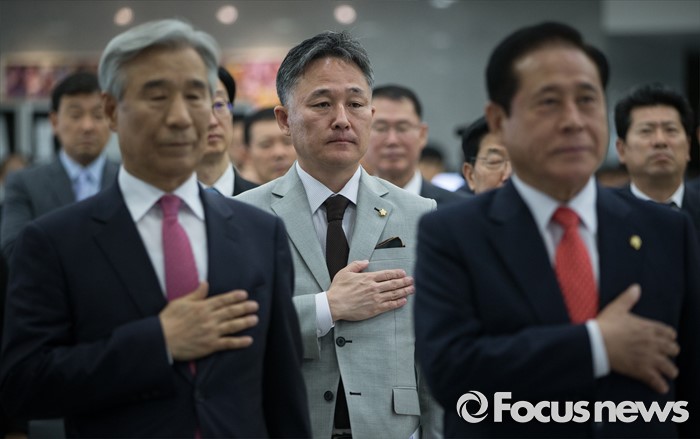 (서울=포커스뉴스) 표창원(가운데) 더불어민주당 의원이 14일 오전 서울 여의도 국회 의원회관에서 열린 국회도서관 박람회 개막식에 참석해 국기에 대한 경례를 하고 있다.