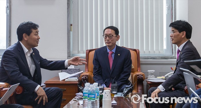 (서울=포커스뉴스) 14일 오전 서울 여의도 국회에서 3당 원내수석이 회동에 앞서 대화를 나누고 있다. 왼쪽부터 김관영 국민의당 원내수석부대표, 김도읍 새누리당 원내수석부대표, 박완주 더불어민주당 원내수석부대표.