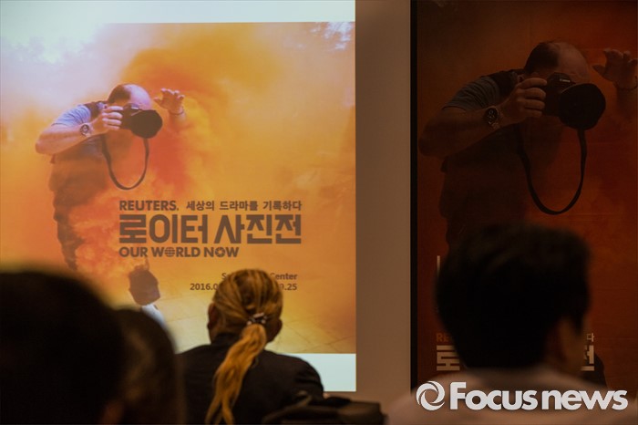 (서울=포커스뉴스) 14일 오전 서울 마포구 한 카페에서 열린 '로이터 사진전, 세상의 드라마를 기록하다' 기자간담회에서 참석자들이 전시설명을 듣고 있다. 이번 전시는 오는 25일부터 9월 25일까지 예술의전당 한가람미술관에서 개최된다.
