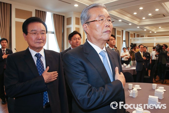 (서울=포커스뉴스) 김종인 더불어민주당 비대위 대표 등 의원들이 14일 오전 서울 여의도 국회 귀빈식당에서 열린 보훈단체장과의 간담회에 참석해 국기에 대한 경례를 하고 있다.
