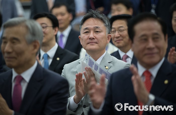 (서울=포커스뉴스) 표창원(가운데) 더불어민주당 의원이 14일 오전 서울 여의도 국회 의원회관에서 열린 국회도서관 박람회 개막식에 참석해 박수치고 있다.