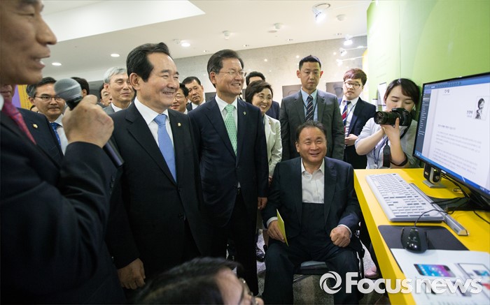 (서울=포커스뉴스) 정세균(왼쪽 두번째) 국회의장과 천정배(왼쪽 세번째) 국민의당 공동대표가 14일 오전 서울 여의도 국회 의원회관에서 열린 국회도서관 박람회 개막식에 참석해 이은철(왼쪽) 국회도서관 관장의 안내를 받으며 디지털화 된 국회도서관을 설명하고 있다.
