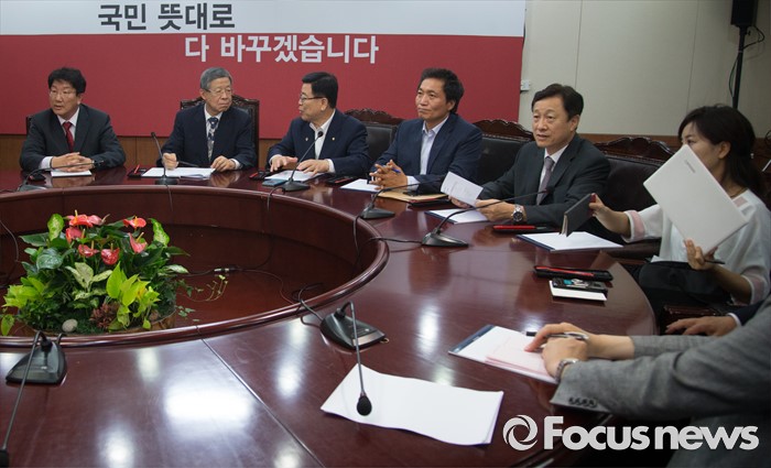 (서울=포커스뉴스) 김희옥 새누리당 혁신비상대책위원장과 김광림 정책위의장을 비롯한 혁신위원들이 14일 오후 서울 여의도 국회에서 회의를 하고 있다.
