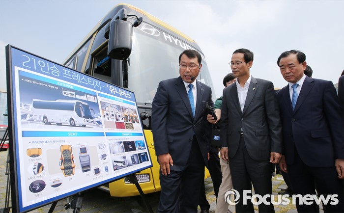 (세종=포커스뉴스) 프리미엄 고속버스 도입에 앞서 시승행사가 14일 오전 세종시 정부세종청사 제2주차장에서 열렸다. 최정호 국토교통부 2차관이 관계자로부터 현대자동차 21인승 프레스티지 유니버스에 대한 설명을 듣고 있다.