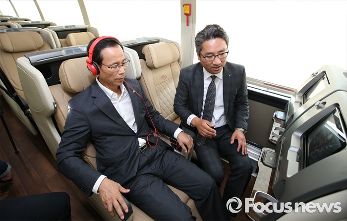 (세종=포커스뉴스) 프리미엄 고속버스 도입에 앞서 시승행사가 14일 오전 세종시 정부세종청사 제2주차장에서 열렸다. 최정호 국토교통부 2차관이 관계자로부터 기아자동차 뉴 그랜버드 프리미엄 골드 익스프레스 설명을 듣고 있다.