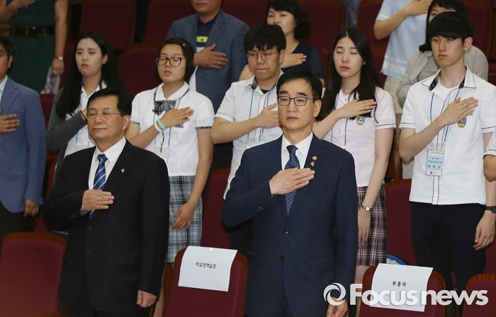 (세종=포커스뉴스) 이준식 부총리 겸 교육부 장관이 14일 오후 세종시 정부세종청사 15동 대강당에서 열린 생명존중 교육자료 및 수기공모전 시상식에서 국기에 대한 경례를 하고 있다.