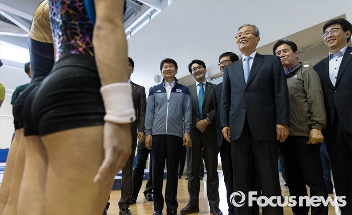 (서울=포커스뉴스) 리우데자네이루 하계올림픽을 52일여 앞둔 14일 오후 서울 노원구 태릉선수촌을 방문한 김종인 더불어민주당 비상대책위원회 대표가 기계체조 국가대표 선수들을 격려하고 있다.