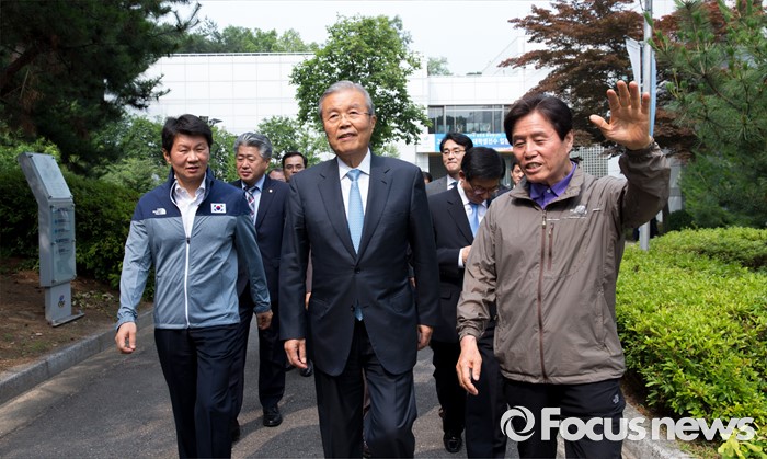 (서울=포커스뉴스) 리우데자네이루 하계올림픽을 52일여 앞둔 14일 오후 서울 노원구 태릉선수촌을 방문한 김종인(가운데) 더불어민주당 비상대책위원회 대표가 최종삼 태릉선수촌장의 설명을 들으며 이동하고 있다.
