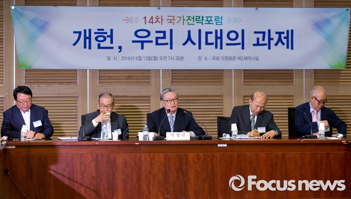 황 교수는 "의원내각제는 내각불신임권, 국회해산권을 당연히 포함하는 것으로 생각하는데 그럴 필요성은 없다"라면서 "대통령제처럼 내각에 임기를 줄 수 있다"고 의견을 냈다.13일 오전 서울 여의도 국회 의원회관에서 '개헌, 우리 시대의 과제'란 주제로 열린 14차 국가전략포럼에 참석한 인명진(왼쪽 세번째) 목사가 발언하고 있다. 2016.06.13 박동욱 기자