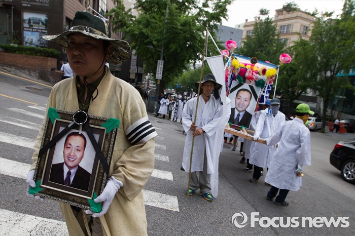 (서울=포커스뉴스) 14일 오후 유성기업 노동자 故 한광호씨의 분향소를 양재동 현대차 본사 앞으로 옮기는 꽃길 100리 행진 2일째에 참여한 노동자들이 국회를 출발해 한남동 현대차 정몽구 회장 집으로 행진하고 있다.
