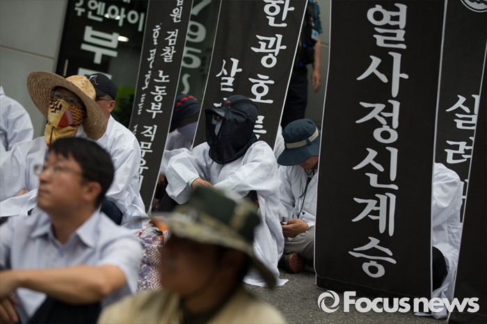 (서울=포커스뉴스) 14일 오후 유성기업 노동자 故 한광호씨의 분향소를 양재동 현대차 본사 앞으로 옮기는 꽃길 100리 행진 2일째에 참여한 노동자들이 국회를 출발해 한남동 현대차 정몽구 회장 집으로 향하던 길에 경찰과 대치하고 있다.