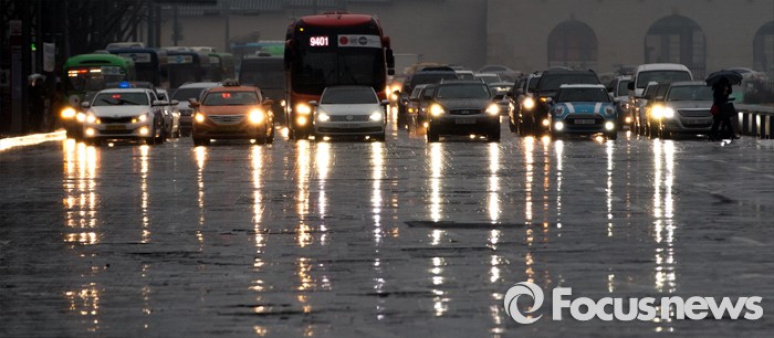 기상청은 또 "장마전선은 23일에 다시 남쪽으로 내려갈 가능성이 있으나 위치와 강도는 북태평양고기압의 발달 정도에 따라 매우 유동적"이라며 "향후 기상정보를 참고할 것"을 당부했다.(서울=포커스뉴스) 전국 대부분 지역이 흐리고 비가 내리는 12일 오전 서울 광화문광장에서 차량들이 전조등을 켜고 운행하고 있다. 2016.02.12 김인철 기자