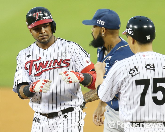 (서울=포커스뉴스) 14일 서울 잠실구장에서 열린 2016 프로야구 NC-LG 경기 3회말 1사 2루에서 LG 히메네스가 1타점 좌익수 왼쪽 안타를 치고 1루에서 한혁수 코치의 축하를 받고 있다.