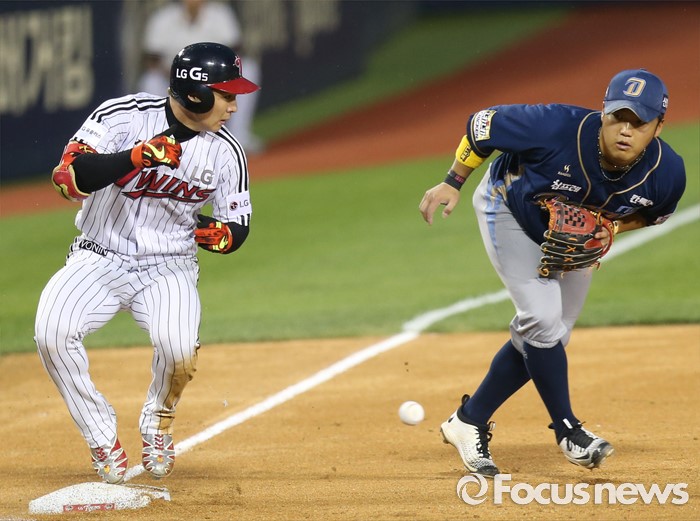 (서울=포커스뉴스) 14일 서울 잠실구장에서 열린 2016 프로야구 NC-LG 경기 4회말 1사 1루에서 LG 오지환이 좌익수앞 3루타를 치고 3루에서 세이프되고 있다.