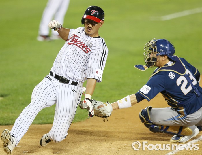 (서울=포커스뉴스) 14일 서울 잠실구장에서 열린 2016 프로야구 NC-LG 경기 8회말 2사 2루에서 LG 대타 정주현의 좌전 안타때 2루주자 박용택이 NC 포수 용덕한의 태그를 피하며 홈에서 세이프되고 있다.