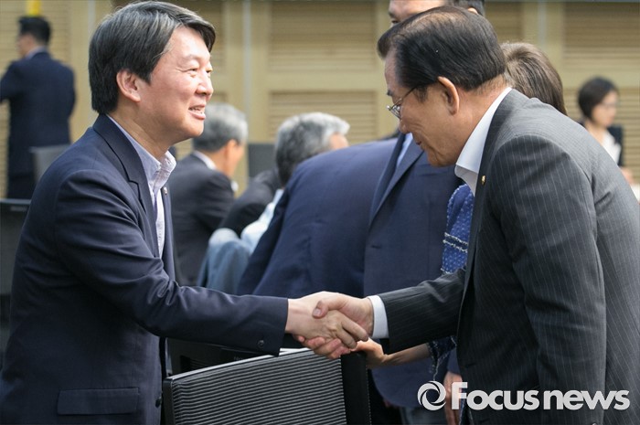 (서울=포커스뉴스) 15일 오전 서울 여의도 국회 의원회관에서 열린 15차 국민의당 정책역량강화 집중 워크숍에 참석한 안철수(왼쪽) 상임공동대표와 박준영 의원이 인사하고 있다.