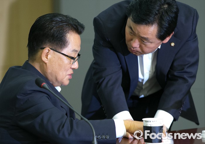 (서울=포커스뉴스) 15일 오전 서울 여의도 국회 의원회관에서 열린 15차 국민의당 정책역량강화 집중 워크숍에 참석한 박지원(왼쪽) 원내대표와 김관영 원내수석부대표가 대화하고 있다.